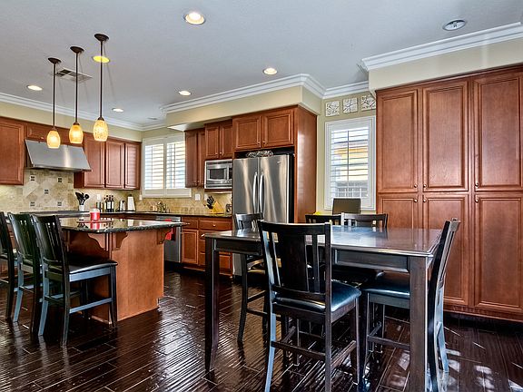 This fabulous home in Old Creek Ranch has been meticulously maintained. Beautiful upgrades throughout. As you enter, you'll enjoy the gorgeous Brazilian hardwood floors. The kitchen is a chef's delight featuring a 6 burner gas cook top, built in wine fridge, granite counter tops, lovely cabinetry, stainless appliances, built in desk & center island. The backyard is an entertainer's delight with a built in barbecue, outdoor fireplace, fire pit with gorgeous glass, water feature & hot tub.