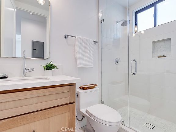 Exciting new three-story townhome in North Redondo with a rooftop deck and views of LA! The first floor features two bedrooms, a laundry area with LG washer & dryer units, and an epoxy resin-floored garage pre-wired for an EV charger. Each bedroom comes with roller shades for privacy and comfort. On the next floor you'll find a luxe kitchen with a Thermador fridge & dishwasher, Monogram 36" all-pro gas range (6 burners), and a Sharp microwave drawer. This floor also has a living room balcony & fireplace, as well as integrated speakers to set the mood. The primary bedroom welcomes you with its own fireplace, walk-in closet, and a lovely bathroom with a resin freestanding tub. Other significant features of this home include a central HVAC system with an electric heating furnace and security cameras. As for location, you're just a mile away from the Interstate 405 and near plenty of popular shops, restaurants, and stores heading north or south!