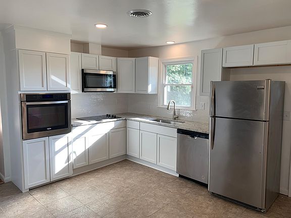 This home offers 3 bedrooms and 1 full bath with a large living room, formal dining room, and a spacious kitchen with recent updates including new kitchen cabinets and granite countertops. The kitchen also features a side by side stainless steel refrigerator, dishwasher and a new stainless steel wall oven and cooktop.