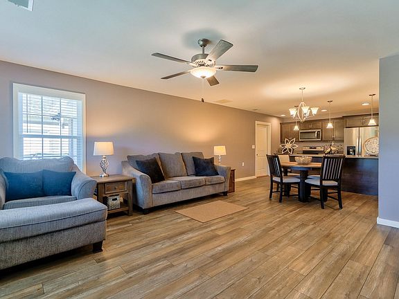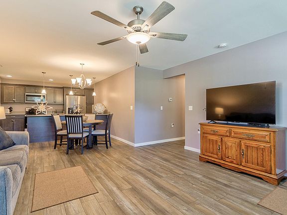 Welcome to this charming patio-style condominium in Hickory Trace featuring 2 bedrooms and 2 full baths in a great, convenient east side location! The kitchen offers beautiful countertops, a breakfast bar, and a dining area that opens to the spacious living room. The owner’s suite includes a walk-in closet and a full bath with a walk-in shower, while the second bedroom also features its own walk-in closet. Enjoy a one-car attached garage with a tankless water heater and side service door, plus extra parking in front. The home includes a covered front porch, privacy fencing, and landscaping—move-in ready and perfect for easy, comfortable living!