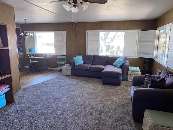 Move in ready in a gated 55 + Park with lots to offer. This home has been updated inside with new carpet and lovely laminate flooring throughout. The main bedroom is spacious with a dressing/closet area. The kitchen is open with a formal dining area and space in the kitchen for a table as well. The living room has plenty of space for your furnishings and more .Lovely plantation shutters and ceiling fans throughout keep the home nice and cozy winter or summer. 2 storage sheds included along with refrigerator/washer & dryer.