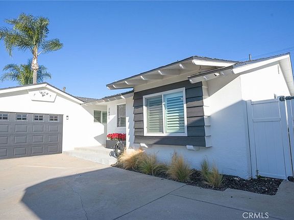 Entry Spec to a mid-century modern trim with new concrete, 3 light custom hammered glass door. New Bamboo Flooring compliments the raised ceilings throughout the home.New custom kitchen consists of Custom Navy and White Cabinets complimented by Moen Brush Gold faucets, matching hardware fixtures and lighting throughout the home, providing a perfect view of your indoor / outdoor living space through a custom 3 panel slider to open out to your patio and pool. Stay cool out the pool or inside with a brand new A/C system. The true Master Suite includes a room-sized built in closet, New master bath, Oversized shower with floor to ceiling tile, all accented to match the entire homes finishes. Raised ceilings throughout the entire house, new windows, and professionally designed side garden with landscape lighting. Don't miss this forever home!