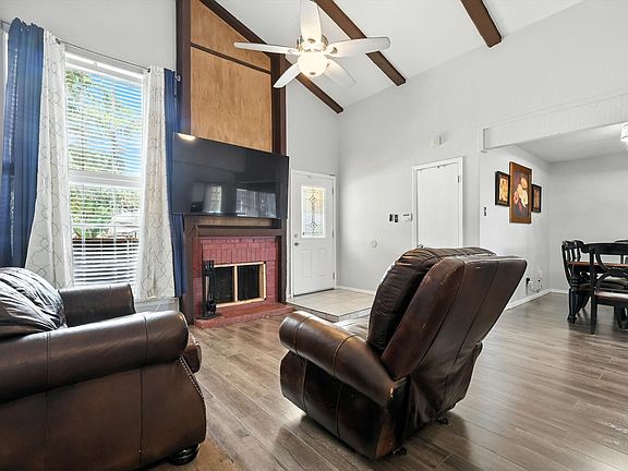 Cozy fireplaceSide patioFlexible spaceVaulted ceilingsBrand new privacy fenceSpacious primary bedroomCharming brick accent wall