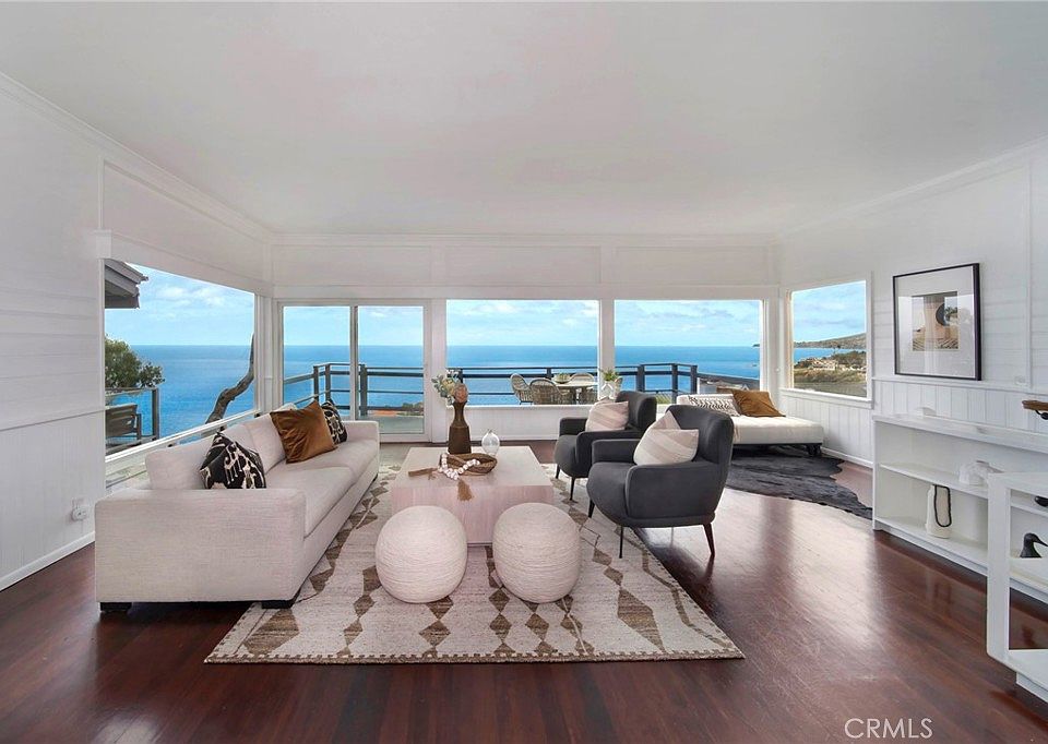 From breathtaking, 180-degree whitewater, coastline and Catalina Island views to its Cape Cod-inspired architecture, this versatile and spacious home captures the timeless charm of Laguna Beach. Just one row from the sand, the blufftop residence showcases panoramic vistas that span the coastline and beyond. Built in 1941, it offers exceptional privacy from the street, reserving the full impact of its jaw-dropping ocean setting for residents and guests. Expansive, unobstructed ocean views greet you immediately upon entry, with a light-filled main level that flows seamlessly from the dining room to a generous fireplace-warmed great room wrapped in vast windows. Breaking waves, glittering evening lights, Catalina Island, vivid sunsets, coastal hills, and Laguna’s iconic shoreline all compete for your attention, creating a constantly shifting canvas of natural beauty. These sweeping views extend through both levels of the home, as well as a large deck ideal for entertaining. A powder room is also featured on this floor, and a fully appointed kitchen displays white cabinetry, Silestone quartz countertops, stainless steel appliances, an imported Blanco sink, and direct access to an attached two-car garage. Wood flooring enriches the main level, while abundant built-in cabinetry and storage are enjoyed throughout. Custom craftsmanship is evident in the beamed ceilings, wainscoting, shiplap, white wall panels, and crown molding. The lower level hosts three bedrooms and two baths, including an en suite with bonus space perfect for a studio, office, or creative retreat. Two additional bedrooms boast stunning ocean views, with one offering a wood-burning fireplace with gas starters. A secondary entrance and access to an ocean-view patio further enhance the home’s versatility. Enjoy a prime location moments from Victoria Beach and its iconic pirate’s tower, Aliso Beach, and Laguna’s Main Beach and village. Nestled in a peaceful setting, this coastal retreat—once home to world-renowned philosopher Jacques Derrida—offers effortless access to sun, surf, and sand. Luxurious resorts, top-rated schools, and scenic trails are all just minutes away, making this a rare opportunity to own a piece of Laguna’s rich history and a front-row seat to the coast’s most spectacular views.