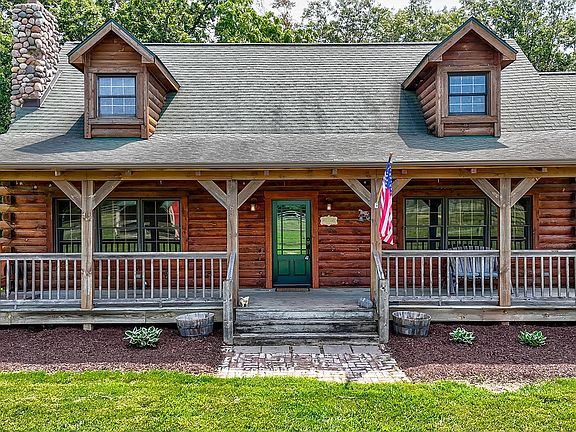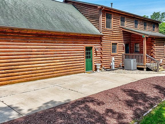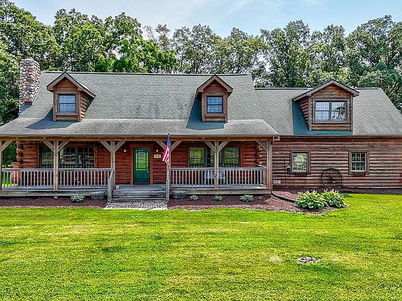 Nestled in the heart of nature, this log home is a perfect blend of rustic charm and modern comfort ~ The home welcomes you with a vast covered front porch, perfect for enjoying peaceful mornings or relaxing evenings ~ The simple kitchen, equipped with table space, is ideal for casual meals and conversations ~ The impressive great room is flooded with natural light, high beamed ceilings and a cozy stone fireplace that adds a touch of rustic elegance ~ The four bedrooms are a sanctuary of comfort, offering serene views of the pastures and surrounding landscape ~ The grand master suite features a private master bath and french doors leading out to the barn ~ The family room, complete with a loft, overlooking the great room, offers a cozy space for gathering ~ The main floor offers a well-appointed laundry room and convenient 1/2 bath, located just off the 2.5 car attached garage, offering ample space for vehicles and storage ~ A full, unfinished basement that is roughed in for another bathroom, provides a blank canvas for you to customize according to your needs ~ The immaculate horse barn conveniently located a short walk from the house, offers four stalls; perfectly level and lined with ag lime, a chicken coop, a fully equipped tack room, storage, water and electric ~ The expansive acreage includes three well maintained pastures, providing a "lean to" and plenty of room for horses to graze and roam ~ Whether you're a horse lover or someone who cherishes the serenity of rural life, this property is a slice of heaven