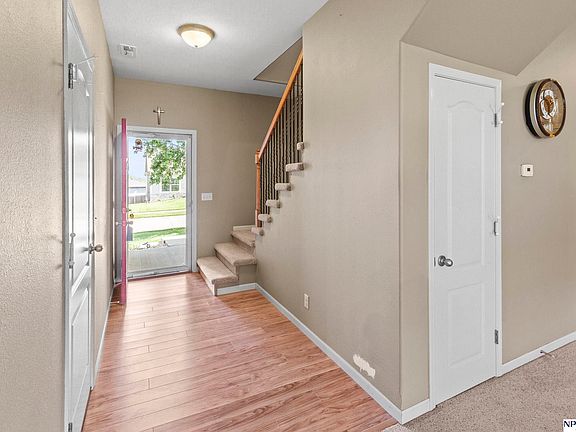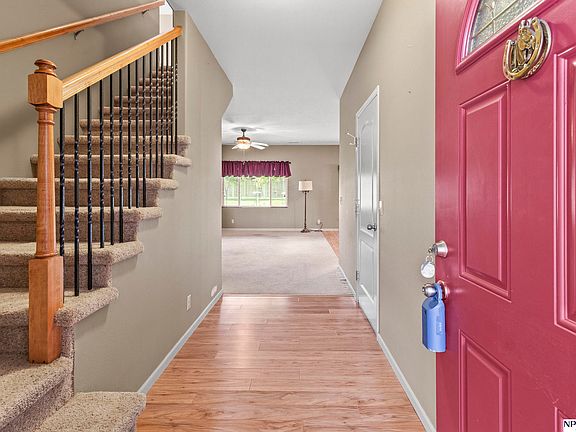 Located on a flat lot in the desirable Elkhorn School District, this 1.5-story Energy Star Certified home features 3 main-level bedrooms and a spacious upstairs loft, perfect for a second living area, office, or playroom. The large kitchen island offers generous prep space and seating, ideal for entertaining. Additional highlights include vinyl siding, a full sprinkler system, and a relaxing whirlpool tub. The primary suite boasts a walk-in closet that doubles as a concrete-reinforced storm shelter. Efficient, safe, and comfortable living!