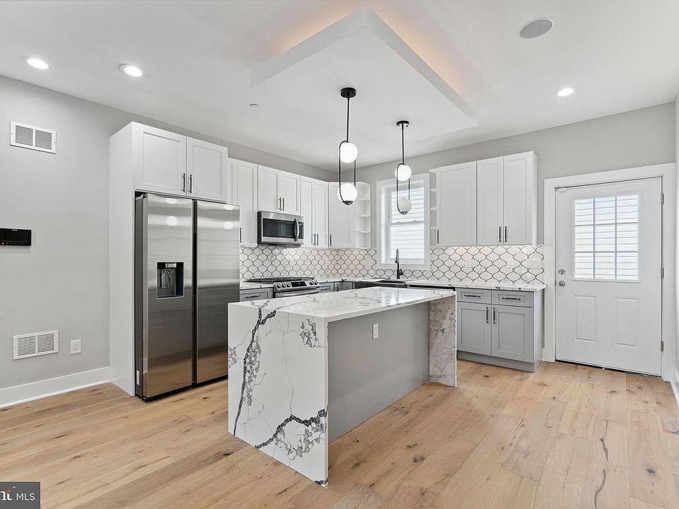 Welcome to 2622 Tulip Street! Sophisticated Newly Built 4 Bedroom & 3 full Bathroom Townhouse in Philly’s favorite neighborhood Fishtown. This pristine brand-new construction home comes with a desirable 10-YEAR TAX ABATEMENT & 1-YEAR BUILDER WARRANTY. Home features 2800 SQ FT of total living pace with 9ft high ceilings throughout. The light and airy open floor plan takes you from the spacious living room with beautiful electric fireplace , through a large dining area with vertical wooden panels into a stunningly appointed chef’s kitchen in the rear. The kitchen is well equipped with Stainless Steel Samsung Appliances & Modern-Classic White /Black-vein Quartz countertops with an esthetically pleasing & functional kitchen island, plus additional storage and a gorgeous waterfall element on each side. This kitchen also features black finishes, designer light fixtures & dual-tone, soft close shaker cabinets as well as stylish backsplash. Up the steps - the second floor consists of two large bedrooms offering plenty of natural light & generous closets; a convenient hallway laundry room with a top-of-the-line Samsung washer and dryer. Second-floor full bathroom, featuring stylish modern vanity, and bathtub/shower combo. Third Floor Primary Suite awaits with a wet/dry espresso bar at the landing - leading into an enormous Primary Bathroom that features modern dual vanity, LED mirror, and an enticing dual shower with 2 large rain shower heads, chrome finishes, large frameless sliding glass doors. The extremely spacious primary bedroom welcomes you with plenty of natural light from two sides & 2 walk-in closets. From the third floor, you may escape to a large roof deck with city skyline views to unwind & entertain. The fully finished basement acts as a 4th bedroom and flex space perfect for a home gym! This space is equipped with another stunning bathroom with a walk-in shower. This energy-efficient home can be easily monitored with the convenience and efficiency of dual-zoned Hvac and the help of the Nest Smart Thermostat system, which can be easily controlled right from your smartphone. Exterior cameras offer added security features with an alarm system already in place. This quaint and walkable neighborhood also comes with the convenience of close proximity to 95 N & 95 S ramps. The location represents the ultimate lifestyle combination of both ease of parking and privacy, engaged community, Horatio B. Hackett School Elementary catchment, and a short walk to highly accredited local Fishtown dining scene Memphis Tap Room, Cedar Point, Loco Pez, Izakaya by Yanga, Pizza Brain. Cafes like Re-Animator, Hello Doughnuts, and Starbucks. Plus Local Riverwards produce market, Gyms, Greens Grow, dry cleaners, pharmacies, grocery stores, nail salons, Wawa, and all other services Fishtown residents may need. Please join us to experience this beautiful turn-key home in person at our Open House - this coming Saturday 11-12 pm ( light refreshments provided )