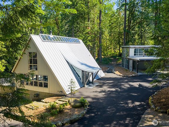 As seen in Dwell Magazine July 2025! A dramatic steel-and-glass A-frame designed by renowned Sandler-Kilburn Architects, this awe-inspiring home is a bold expression of modern design set on over an acre of serene, wooded landscape. Striking & sophisticated, the home blends industrial elements with the warmth of natural materials. Inside, custom walnut cabinetry frames a sleek, contemporary kitchen with new cabinetry & refrigeration, while a Tulikivi soapstone fireplace anchors the living space with sculptural elegance. Primary suite features a stainless steel Japanese soaking tub for ultimate relaxation. A Detached steel-and-glass garage or studio includes separate meter. 3 heat sources & covered parking for 4 cars. Skylights & EV Charger!