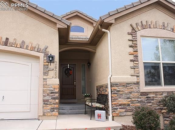 Beautiful low maintenance ranch floor plan in desirable Flying Horse community. Lawn care included in dues. Low maintenance exterior with stucco and tile roof. 4 bedrooms, 3 bathrooms, 2 car garage. Main level includes master bedroom and master bath, second bedroom, full bathroom, dining room, living room, and kitchen. Spacious living room walks out to private patio and is adjacent to kitchen, master bedroom, and formal dining room. Breakfast bar and island in kitchen with low maintenance Corian counter tops. Large master bedroom with 5 piece master bath and walk-in closet. Stackable laundry connections in kitchen closet and full size washer and dryer in basement. Basement includes a large rec room with electric fireplace, two bedrooms, full bath, and laundry room. Recent upgrades include A/C, finished garage, and newer carpet on main level.
