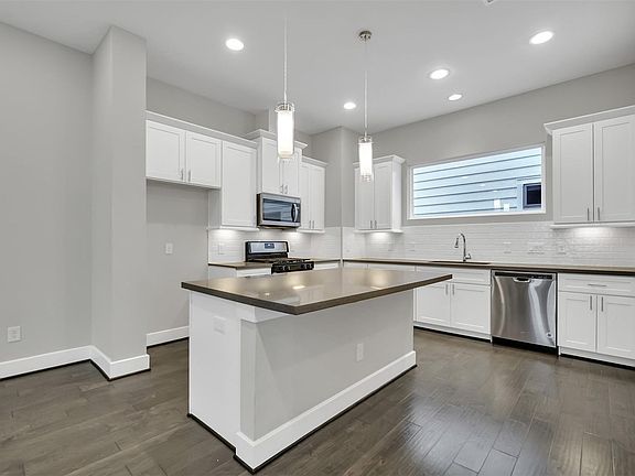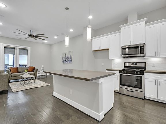 Step inside to find soaring ceilings and abundant natural light. Modern finishes throughout: engineered wood flooring, plush carpeting, and elegant tile and a spacious, open-concept living/dining area with a convenient powder bath on the main floor. The kitchen is a chefs dream with shaker-style cabinets, stainless steel appliances, gas range, large island, and upgraded window coverings.