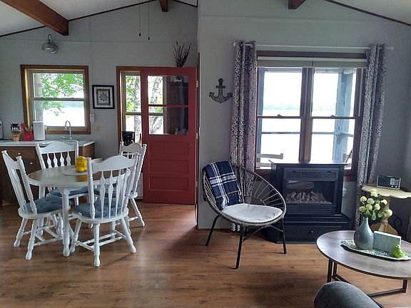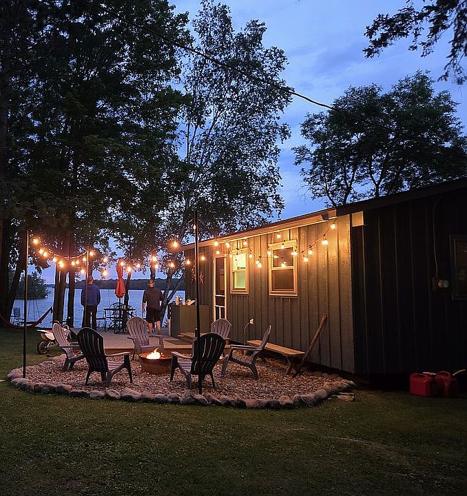 Seasonal lakefront cabinScreen porchCozy firepit areaStunning water viewsVaulted ceilingsOpen living spacePrivate shoreline