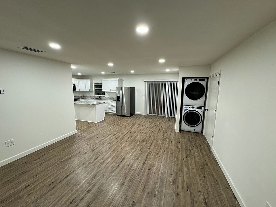 Modern 3 bedroom two bathroom house with stainless steel appliances, dishwasher, A/C, washer/dryer, private large fenced in back yard, updated bathrooms, storage shed available, off street parking for up to two cars, and pest control included. EV charging outlet and RV parking available for additional fee.