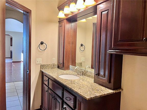 Moore Schools! Beautiful home located in Rock Creek! Oversize living room with gas fireplace and 1 wall of windows to the ceiling, allowing ample light to enter. Wood laminate flooring in the living area, entry and front bedroom. Front room does have a closet as well as a solid door but it could be used as an office if needed. Kitchen has island, stainless steel appliances, including an LG gas, self cleaning stove, LG refrigerator with double pull out freezer space and walk-in pantry. Master bedroom has a tray ceiling with ceiling fan, double vanities, shower and Jetta tub, as well as a walk-in closet. Laundry room is not a pass-through to garage and has additional storage space as well as a sink and an extra closet. Storm shelter in garage, Sprinkler system, granite windowsills and 2" blinds throughout. Community has a pool and playground. Application fee $42/adult. Pets ok on a case by case basis. Security deposit $2000. Renter's Insurance is required. Owner pays HOA fee. Tenant responsible for all utilities, lawn, tree & flowerbed care & providing washer/dryer