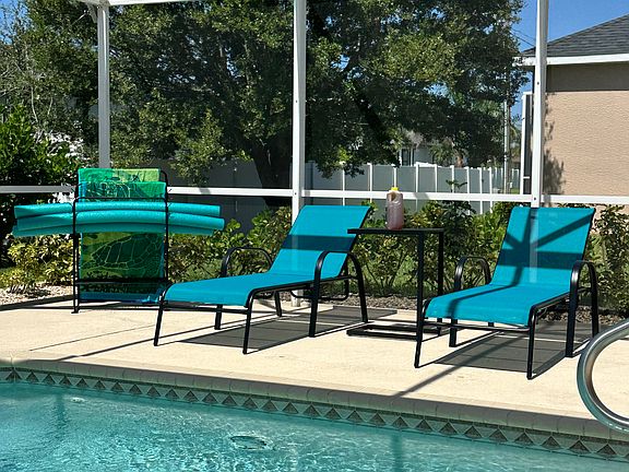 The crown jewel of Villa 52 is the southern-facing outdoor living area. Enjoy a large saltwater pool, hot tub, shaded dining under the truss, a cafe seating area, lounge chairs, Roku TV, and plenty of pool floats. Ceiling fans in the covered area help keep you cool on sunny Florida afternoons.