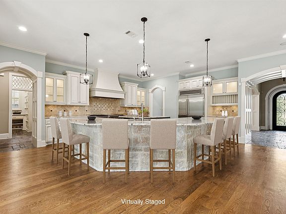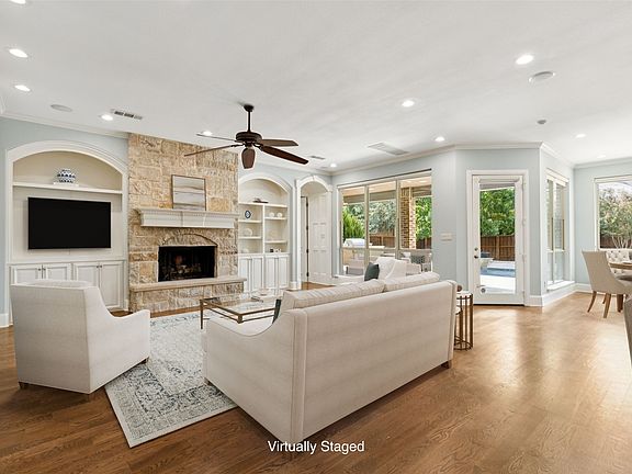 Beautifully designed with remarkable attention to detail, this Castle Hills home offers over 5,300 square feet of living space on a landscaped 0.325-acre lot. The flexible floor plan includes five bedrooms plus a private office, elegant dining areas, a spacious game room, and a fully equipped media room. The gourmet kitchen is the centerpiece of the home with built-in refrigerator, commercial-grade range, double ovens, expansive island, and walk-in pantry. It flows seamlessly into the family room with stone fireplace and views of the backyard. The primary suite on the main level is a private retreat featuring dual vanities, soaking tub, separate shower, and a generous walk-in closets with secondary washer and dryer connections. Highlights include hardwood and stone floors, wainscoting, decorative lighting, granite counters, multiple staircases, and a 3-car garage with alley access. Smart wiring, built-ins, and abundant storage add to the home’s functionality. Outdoor living is exceptional with a sparkling pool, outdoor shower, covered patio, built-in grill, and full outdoor living center—perfect for entertaining or relaxing. The landscaped yard offers privacy and plenty of space to enjoy year-round. Located in the desirable Castle Hills community, residents enjoy access to walking trails, lakes, parks, golf, tennis, and a vibrant town center with shops and dining. Zoned to Lewisville ISD schools, this property combines luxury, comfort, and convenience in one of North Texas’ premier neighborhoods.