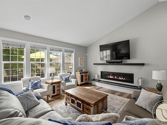 paint, tile, and gas fireplace. The vaulted living room with southern exposure opens to the kitchen and dining area that steps out to the