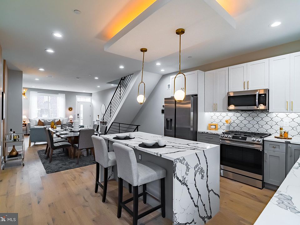 Welcome to 2624 Tulip Street! Sophisticated Newly Built 4 Bedroom & 3 full Bathroom Corner Townhouse in Philly’s favorite neighborhood Fishtown. This pristine brand-new construction home comes with a desirable 10-YEAR TAX ABATEMENT & 1-YEAR BUILDER WARRANTY. Home features 2800 SQ FT of total Living Space with 9ft high ceilings throughout. The light and airy Open Floor plan takes you from the spacious living room with gray slate electric fireplace , through a large dining area with vertical wooden panels into a stunningly appointed chef’s kitchen in the rear. The kitchen is well equipped with Stainless Steel Samsung Appliances & Modern-Classic White /Black-vein Quartz countertops with an esthetically pleasing & functional kitchen island, plus additional storage and a gorgeous waterfall element on each side. This kitchen also features gold-tone hardware finishes, designer light fixtures & dual-tone, soft close shaker cabinets as well as stylish backsplash. Up the steps - the second floor consists of two large bedrooms offering plenty of natural light & generous closets; a convenient hallway laundry room with a top-of-the-line Samsung washer and dryer. Second-floor full bathroom, featuring stylish modern vanity, and bathtub/shower combo. Third Floor Primary Suite awaits with a wet/dry espresso bar at the landing - leading into an enormous Primary Bathroom that features modern dual vanity, LED mirror, and an enticing dual shower with 2 large rain shower heads, chrome finishes, large frameless sliding glass doors. The extremely Spacious Primary bedroom itself situated on the SE corner of the house welcomes you with plenty of natural light from two sides & 2 walk-in closets. From the third floor, you may escape to a large roof deck with city skyline views to unwind & entertain. 4th bedroom and flex space perfect for a home gym can be found on the cellar lever in a fully finished basement with another stunning bathroom with a walk-in shower. This energy-efficient home can be easily monitored with the convenience and efficiency of dual-zoned Hvac and the help of the Nest Smart Thermostat system, which can be easily controlled right from your smartphone. Exterior cameras offer added security features with an alarm system already in place. This quaint and walkable neighborhood also comes with the convenience of close proximity to 95 N & 95 S ramps. The location represents the ultimate lifestyle combination of both ease of parking and privacy, engaged community, Horatio B. Hackett School Elementary catchment, and a short walk to highly accredited local Fishtown dining scene Memphis Tap Room, Cedar Point, Loco Pez, Izakaya by Yanga, Pizza Brain. Cafes like Re-Animator, Hello Doughnuts, and Starbucks. Plus Local Riverwards produce market, Gyms, Greens Grow, dry cleaners, pharmacies, grocery stores, nail salons, Wawa, and all other services Fishtown residents may need. Please join us to experience this beautiful turn-key home in person at our Open House - this coming Saturday 11-1 pm ( light refreshments provided )