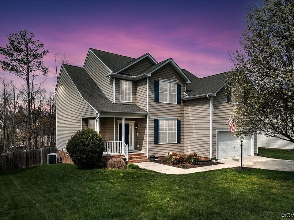 Welcome home to this gorgeous two-story home in the heart of Watermill. This 5 bedroom / 2.5 bath home features a bright and inviting two-story foyer, columned entry formal dining room, open kitchen with title backsplash, stainless steel appliances, recessed lighting, breakfast bar, and eat-in kitchen area, arched doorways, hardwood floors throughout first floor, gas fireplace, two car garage with shelving for storage, front porch, 12x16 deck, and fenced backyard. Custom barn doors welcome you into the sunroom/office off the kitchen. The master bedroom offers walk-in closet and a master bathroom that features dual vanities, standup shower, and garden tub. Neighborhood amenities include pool, tennis courts, playground, and clubhouse. Conveniently located near the Swift Creek Reservoir, 288 and Powhite Parkway, with easy access to Hull Street and Midlothian Parkway. NEW HVAC in 2021; NEW ROOF in 2020; NEW DECK in 2020; NEW HOT WATER HEATER in 2019.