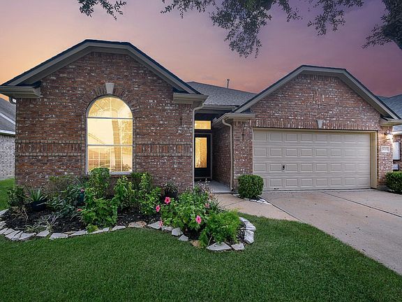 Fantastic, open floorplan for everyday living! Beautifully maintained one-story with peace-of-mind updates: brand new roof and carpet (2025), AC coil/condenser (2022), fence (2023), fresh paint with Sherwin William's best seller Alabaster White and ready for you. A grand, light-filled layout offers formal living/flex space with adorable wallpaper, a chef’s kitchen with double island, breakfast bar, 42” cabinets with luxe gold hardware and walk-in pantry. The heart of the home flows into a bright living room with elegant bay windows, cozy gas fireplace, a mantle for your best family photos. Retreat to the lavish primary suite with custom accent wall, dual vanities, remodeled shower, generous walk-in closet that connects to the utility room. Two additional bedrooms—each with large closets. Unwind beneath a covered patio in your quiet private backyard. Zoned to ALL A-rated schools! Amenities galore—pools, playgrounds, courts, trails, lakes! Easy access to 288, Beltway 8, TMC, PTC.