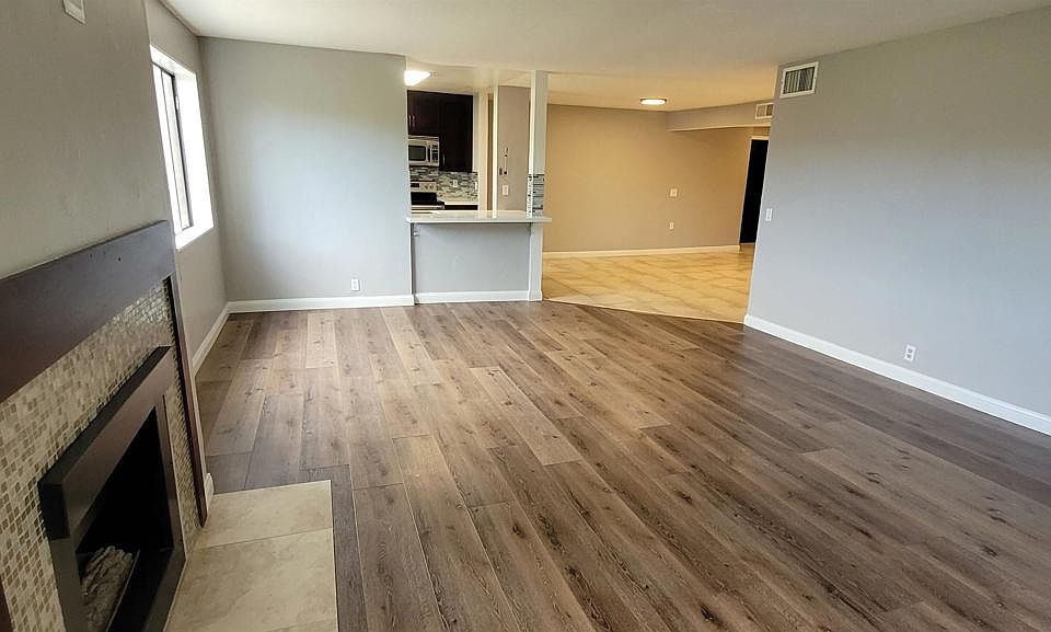 Magnificently remodeled condo with a view of the golf course. Newly installed wide plank high-end flooring and baseboards (no carpet). The kitchen was beautifully remodeled at an earlier date. Furniture in the current pictures will convey if the tenant would like it to stay. Full size washer & dryer included in closet in unit. Newly painted throughout on the vertical walls in the rooms. Upgraded showers. Beautiful community pool & spa. 2 assigned tandem garage parking spots very close to unit. Secure gated complex. Gas fireplace in living room. Large balcony. Close to terrific beaches, shopping, restaurants, and entertainment. No smoking.