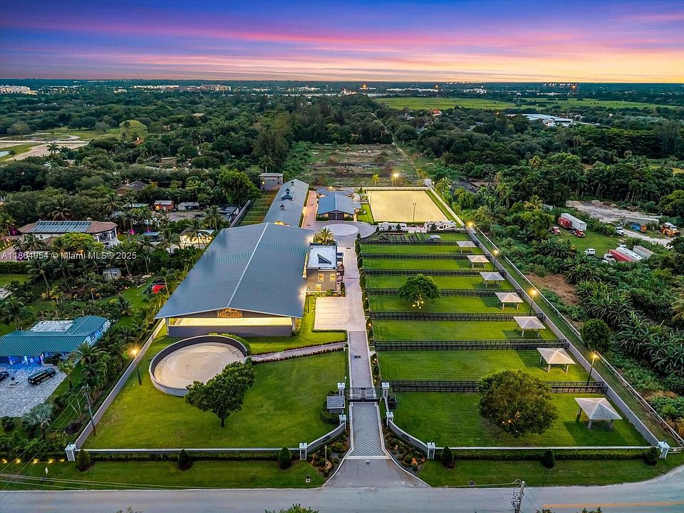 A world-class equestrian estate in Davie combining modern elegance with state-of-the-art facilities. The main residence offers 2 bedrooms, 2 baths, and a private clubhouse with bar. Inspired by European design, the property features Broward’s largest covered arena with isolation system, 5-star rated indoor and outdoor riding arenas, dressage mirrors, hot walker, treadmill, and extra-large paddocks with shaded run-ins. Forty Rower-Rube stalls connect to a full underground drainage system, ensuring no flooding. All buildings are concrete, including a luxury two-story residence and clubhouse, three-story staff housing, with direct access to Davie’s trail system and Vista View Park.