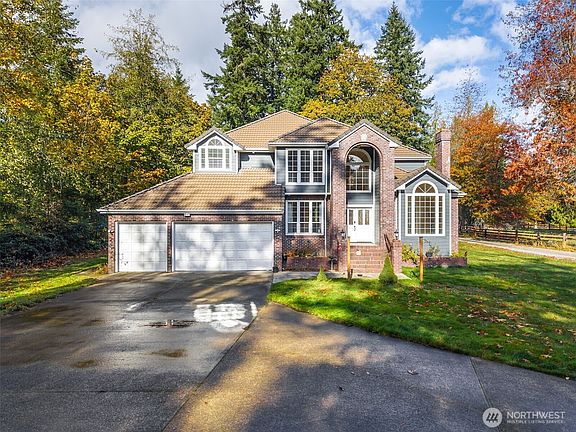Tucked away on a serene 1.8-acre setting, this stunning custom home offers the perfect blend of privacy, comfort, & convenience—just minutes from I-5. Thoughtfully designed home features soaring vaulted ceilings, two gas fireplaces, & an open, inviting floor plan ideal for entertaining or everyday living. Spacious kitchen with island flows into the dining & family rooms, while a den & ¾ bath on the main floor provide flexibility for guests or a home office. Upstairs, the expansive primary suite is a true retreat with a beautifully updated en-suite. Enjoy outdoor living on the deck overlooking the peaceful surroundings. 3-car garage, circular driveway, & RV parking complete this exceptional property. A truly special find in a great location!