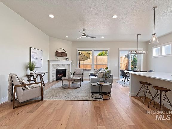 Experience refined living in the desirable 55+ community of Village Bungalows! This gorgeous home is filled with upscale finishes, from rich hardwood floors to a cozy gas fireplace in the great room. The chef’s kitchen boasts Bosch appliances, granite countertops, and a corner walk-in pantry. The spacious primary suite features an elegant inset ceiling, abundant natural light, and a spa-like ensuite bath with dual vanities and a tiled roll-in shower. A second bedroom also offers a private ensuite bath—perfect for guests or multi-generational living. Enjoy the peace of mind of low-maintenance living—community amenities include front and backyard care, snow removal, and a clubhouse with a heated pool and fitness room. Ideally situated in Meridian with convenient access to Eagle Road, making travel throughout the Treasure Valley effortless!