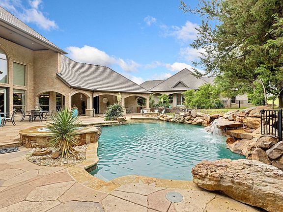 A Private Oasis in Twelve Oaks Estates: Your Yellowstone-Inspired Ranchette!  This one of a kind Luxury Custom and Guest House - Peaceful and Private living in Twelve Oaks, situated on 3.45 acres with a private pond & fountain. Spectacular drive- up, as the main home, is perched over a beautiful private pond with fountain, a park-like setting surrounded by trees. From the full circle driveway, a hitch for your horses and stone steps lead up to the full covered porch and commanding double doors. Multi-Generational w Full Guest House in Twelve Oaks Estates on 3.45 acres. The Best of Both Worlds- living in south Celina and in Prosper ISD. Designed for Entertaining with a 1st Floor MEDIA includes screen, projector & stadium seating. The Living has 2 story high tall windows, stacked stone fireplace, flanked with stone shelves and a full bar. Appointed with custom millwork, moldings & polished concrete floors. Primary suite has a fireplace, exercise room. The spa-like Bath has vessel sinks, granite counters, huge shower, & sauna. The 2nd Bedroom down has a full bathroom. Upstairs leads to an amazing  landing & balcony with two split Bedrooms each w ensuite baths,+ a fun Flex-living space. Resort living-lagoon Pool, Spa, Firepit, Octagonal covered Gazebo with a stone mantled fireplace and hearth  Multiple patios, space for Horses to roam, kids to play soccer & fish at your private pond. MECHANICS: DaVinci 50 yr Roof Class IV Rating installed 2019, Foam Insulation for energy efficiency - main house.  New Spa Heater installed - 2025, the private Pond- recently upgraded deep well for outdoor irrigation- a huge savings on water. Lot -3.45 acres - dimensions-374 ft x 383 ft, City Water and Sewer service for the home.