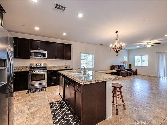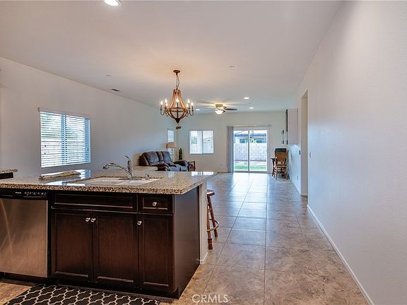 Contemporary D.R. Horton 2017 built "Over 55" home at a fabulous quaint gated resort on a premium corner lot. Great curb appeal with brick type facade accents and covered front porch. Fresh interior paint and tile floors throughout except newly carpeted bedrooms and den that is easily convertible to a 3rd bedroom. Large great/dining room with custom lighting, ceiling fan and slider to the covered patio and lush rear yard. The dream kitchen features granite counters, a breakfast bar island with sink and dishwasher, stainless steel appliances including a 5-burner gas range, included refrigerator, Java cabinets galore and walk-in pantry. Unique big laundry/hobby room with lots of cabinets and folding/work counters. The master bedroom has a ceiling fan and ensuite bathroom with dual sink vanity, shower, privacy commode, linen cabinet and spacious walk-in closet. The guest bedroom has an adjacent full bath with tub. High quality builder features throughout including fire sprinklers and tankless water heater. See photos for the floorplan and a list of the builder's construction features. The finished 2-car garage has a newer garage door and opener with battery back-up and outside key pad. The big back and side yards are surrounded by block walls and include an Alumawood solid ceiling cover over the stamped concrete patio and lush lawn and gardens. The low HOA dues includes front yard maintenance and provides access to the extraordinary association amenities including a beautiful pool, spa, covered lanai, BBQ/ party area, clubhouse with pool table and kitchen plus separate gym building. This community is ideally located about an hour's drive to L.A. and Orange Counties, downtown San Diego, Palm Springs and Idyllwild. Close to Temecula, The Wine Country and Casinos.