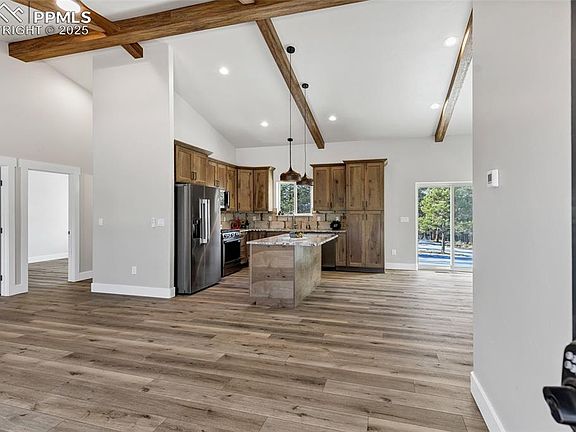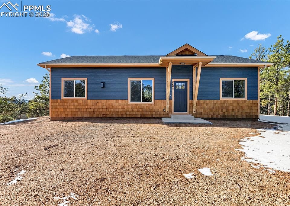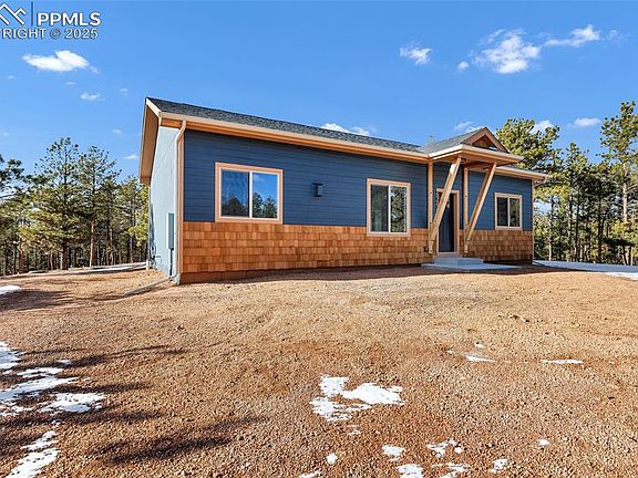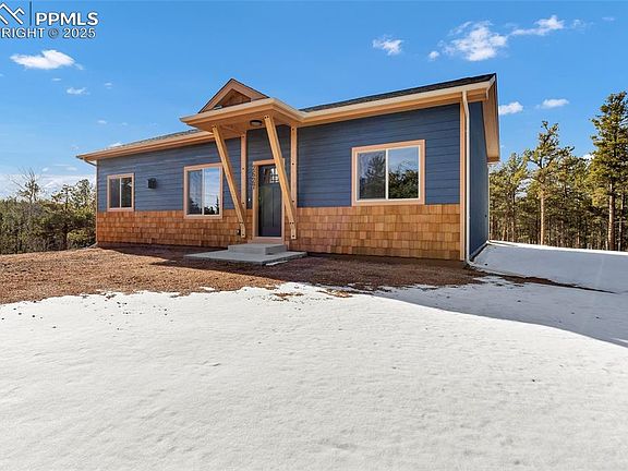 Custom-Built New Construction | Single-Story Mountain Home on 2 Acres Light and bright with abundant windows, this beautifully designed custom home offers serene mountain living surrounded by pine and aspen trees. Enjoy peaceful views of Pikes Peak and the surrounding mountains and forest, an easily accessible lot with excellent sun exposure. Inside, the open-concept great room features vaulted ceilings with decorative box beams and a stunning 36-inch gas fireplace with a wood mantle and floor-to-ceiling stone surround. Premium Republic SPC woodgrain flooring in “Valley Oak” runs throughout — 100% waterproof, antimicrobial, and easy to maintain. The kitchen is a chef’s delight with Made in the USA Legend Cabinetry in rustic birch “Hazel,” soft-close doors and drawers, rollout shelves, granite countertops, and stainless steel appliances including a gas range, refrigerator, dishwasher, microwave, and disposal. The large island includes a double wastebasket cabinet, and the tall pantry offers generous storage. A stylish tile backsplash, crown molding, and stainless steel sink with pull-down faucet complete the space. Other highlights include 10-foot ceilings throughout, a spacious laundry room with a deep utility sink, and propane gas utilities. The exterior showcases timeless craftsmanship — cedar shakes, lap siding, and premium acrylic stucco with an added mesh layer for enhanced durability. Water is supplied by two 1,500-gallon cisterns. There are plenty of opportunities to add a garage or outbuilding if desired. Located in a quiet mountain community with no covenants, this property offers year-round access via Teller County-maintained roads and abundant local wildlife.