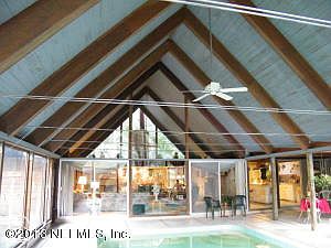This home was featured in Florida Architectural International Magazine and is NOT a cookie cutter. This A-frame home is great for entertaining with lots of privacy, enjoy the relaxing view from the many windows and sliding glass doors, large wooden beams throughout, wood crown molding in most of the house, stone gas fireplace. The master bedroom has a sliding door that opens to the front garden, 2 walk-thru closets, the bath has a built in dresser/vanity and a large step-down shower. The guest bedroom has a double closet and a sliding glass door that opens into the garden area. The 3rd bedroom has 2 sliding glass doors that open to the pool. The kitchen has an island, back splash, sliding cabinets, pantries, and two ovens the sliding glass door that opens to the pool.