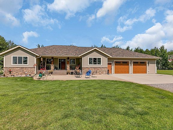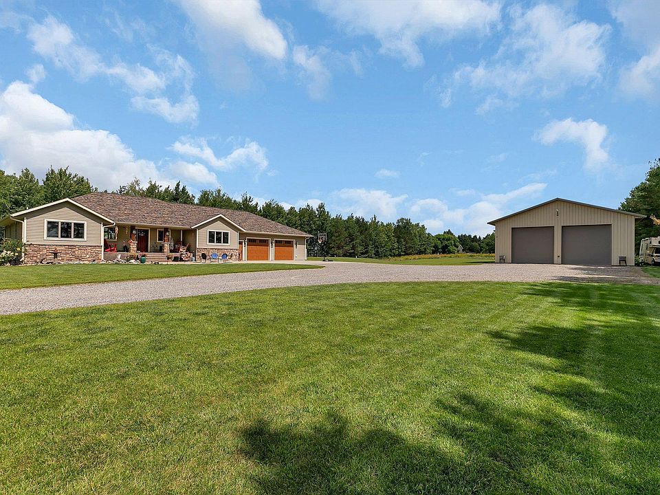 ISLAND LAKE ROAD! Set your sights on this stunning 4 Bed, 4 Bath walk-out rambler on 5 beautiful acres. Destination location, close to downtown Cold Spring and St. Joseph's restaurants, shops, lakes, trails, schools and attractions. Make yourself at home; the main floor boasts a large kitchen with granite countertops, center island with water lines for dishwasher installment, teak flooring, stainless steel appliances, vaulted ceilings, dining room with a bay window overlooking the wooded back yard, a cozy living room with gas fireplace, office nook, mud room, and large main floor laundry room. The main floor primary bed/bath with granite walk-in shower, soaking tub and walk-in closet is sure to please. The lower level hosts three bedrooms, two full bathrooms, wet bar, entertaining area and second laundry room. The 5 acres is a mix of open entertaining space and woods with trails. Inground sprinkler system and 36x48 pole shed. Make this serene escape yours today!