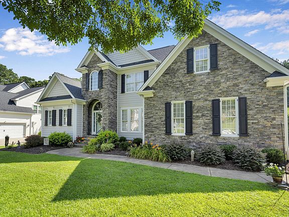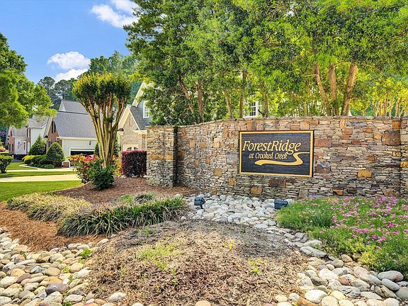 Former Custom Parade Home w/ PRIMARY SUITE on main level located in desirable Crooked Creek! Inside, discover refinished HW floors throughout the main level. Formal Dining Room w/ tray ceiling and wainscoting is great for family gatherings. The 2-story Family Room is bright + features a Gas-log Fireplace and custom built-ins. The Kitchen has white cabinets & under-cabinet lighting, Corian Counters, Tile Backsplash, New Light Fixtures & Hardware and New SS Appliances. 1st Floor Primary Suite is massive w/ Tray Ceiling, Sitting area and Fireplace. The updated Ensuite has Dual Vanities w/ painted cabinets, Tile Shower w/ 2 Rainheads, Water Closet, Linen Closet and a Primary Closet w/ Custom Wood Shelving. Laundry Room w/ Tile Floors, Wood Shelves, Cabinet and an Utility Sink. Upstairs offers 2 Bedrooms, very large walk-in attic, Hall Bath w/ New Tile Floor, New Light Fixtures & Dual Vanities. Bonus Room has spacious closet space & is currently used as another bedroom. Newer features: HW Heater '22, Roof '23, New Light Fixtures in Kitchen + Baths and Custom Trim t/o. Entertain outdoors on the Refinished Deck + Stone Patio that overlooks a serene yard w/ wooded views and a tiny stream. 2 Car Garage has Workbench and the Driveway was expanded. Invisible fence, ADT Alarm and Ting Internet!! Amenities: Playgrounds, Walking Trails, Community Pool + Tennis Courts. Great location near Parks, the new Community Center, Shopping, Restaurants, 540 and only 15 miles to Downtown Raleigh!!