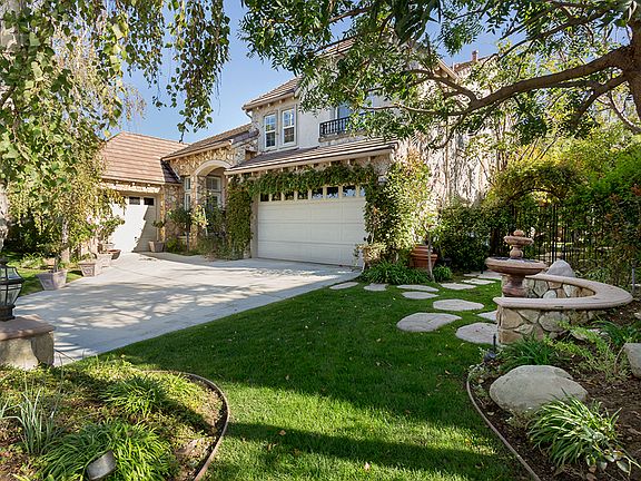 Emotionally unique home with great curb appeal!Flagstone planter walls & flagstone front facia entryway! Backyard is unequaled in lushness and amenities including huge waterfall flowing into oversize pond, stone fireplace, in ground fiberglass spa, 4 patios 1 covered by an upstairs balcony, a wisteria laden pergola ending with another gazeboed patio. There is a 10'x12' miniature art studio replica of the house that can be used for a workroom, studio, potting shed. There are arbors and secret gardens throughout the yard and the hill has 2 stairways with large landings that lead to another patio with gazebo! You can see all of Simi from here! The inside is just as unique with custom paint, hardwood floors throughout, plantation shutters and security system. Family room with FP, surround sound, and custom entertnmt. center. Kitchen has loads of storage, center island, lovely eating area and opens to FR. The rest of the lower floor consists of LR, FDR, BR, bath and laundry. Upstairs has library nook, large computer office, jack and jill bedrooms with full bath but its the master suite that's the stunner with a separate room to use as a sitting room, office or nursery, huge master bath and walk-in closet. Separate linen closet and very large bedroom. MUST SEE!