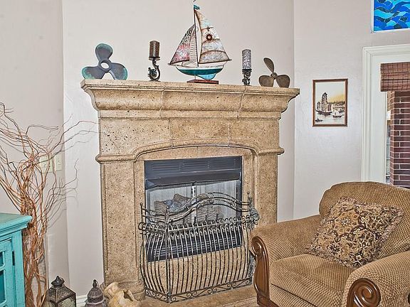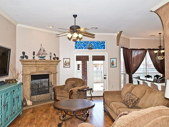 This home is on a cul-de-sac street and has a split floor plan with open concept living! Living room has a corner fireplace, laminate wood flooring and access to the backyard. Study is located at the front of the home and has real wood floors, two built-ins and glass French doors. Kitchen has a built-in stove top and oven, black distressed painted island, over cabinet lighting that can change colors, breakfast bar area and pantry. Dining area is a great size and adorned with lots of windows allowing ample natural light. Master suite has double vanities, separate shower & whirlpool tub and Australian closet. Backyard has covered patio, flagstone open air patio space with pergola & fire pit and custom built storage shed. Storm shelter located in garage!