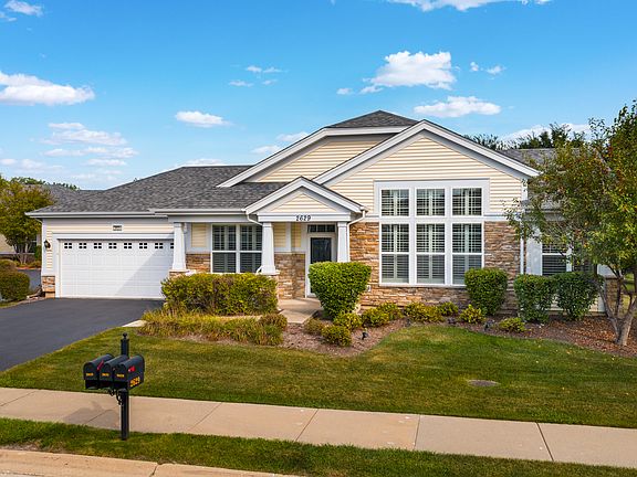 Welcome to resort-style living at Carillon Club, Naperville's premier 55+ active adult gated community! This impeccably maintained Nicklaus model ranch townhome features 2 bedrooms and 2 full bathrooms and is one of the most popular floor plans in the neighborhood. Step inside to find hardwood flooring, 12-foot ceilings, and custom plantation shutters throughout. The open-concept kitchen boasts granite countertops, stainless steel appliances, eat-in area and custom light fixtures. Additional highlights include custom ceiling fans, a heat lamp in the primary bath, a heated sunroom for year-round enjoyment, a security system, and in-unit washer and dryer. Enjoy the convenience of a private driveway (no sharing), Larson storm doors on both the front and side entries, and a drywalled, painted garage floor. Relax on your covered front porch and take in the peaceful surroundings. The Carillon Club community offers unmatched amenities, including indoor and outdoor pools, a children's pool for visiting grandkids, clubhouse, tennis courts, fitness center, golf course, bocce ball, pickleball, and so much more! Conveniently located near downtown Naperville, with easy access to Route 59 shopping, dining, entertainment & Metra . Welcome home!