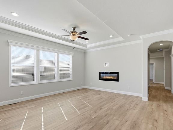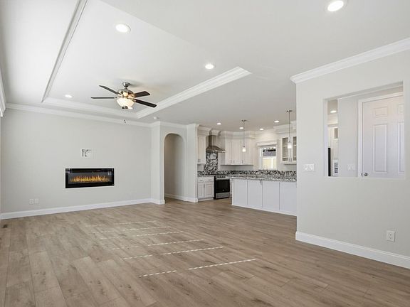 This beautifully designed home features an open floor plan with a bright and airy living room. It includes 9-foot tray ceilings, recessed lighting, a ceiling fan, and an electric fireplace for added warmth and ambiance. The spacious kitchen boasts white quartz countertops, stainless steel appliances, and elegant white cabinetry, making it perfect for family meals or entertaining guests.