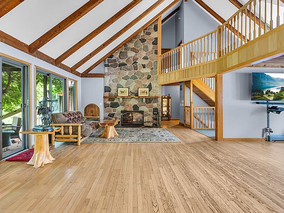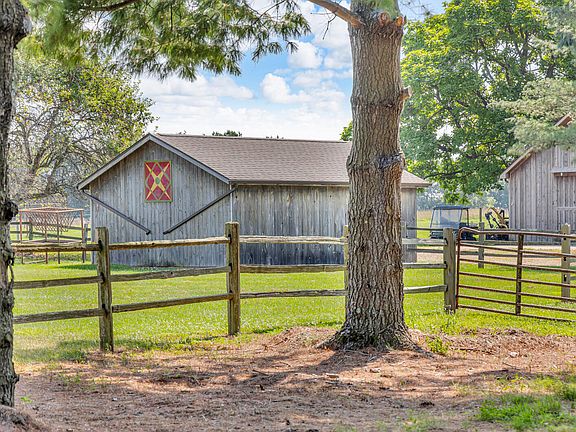Custom built 5-bed- 4-bath retreat on 23.36 acres with Horse Stable and the option for 16.77 more acres! This property blends architectural character with natural beauty. The open floor plan highlights soaring ceilings with unique wood craftsmanship, striking beams and a dramatic wood-burning stone fireplace. A wall of windows fills the great room with light and frames views of the pergola covered patio, the 1-acre pond filled with koi and ducks, the graceful statues and unique gardens. The main-level primary wing offers two en suite baths, a cedar walk-in closet and a flexible adjoining room. Upstairs, a spacious loft adds versatility and scale, joined by 3 bedrooms, a full bath and cedar closet. Finished basement w/ office, recreation space and ample storage. The grounds include fenced pastures, three run-in horse sheds, A hilltop gazebo w/ garden shed & a 5-stall stable w/ heated floors, utilities, workshop and storage—an exceptional equestrian facility and elegant gathering space! .