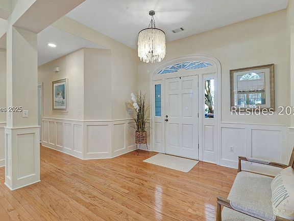 Charming Low Country home on a lush, private half-acre. Open floor plan with family room flowing into the kitchen featuring Viking appliances and travertine floors. Large screened porch with wood-burning fireplace-perfect for cozy evenings. Overlooking hole 3 of the East course, the expansive backyard offers room for a pool and outdoor entertaining. Private well for irrigation means no water bills for landscaping. Peaceful setting with plenty of privacy and Southern charm!