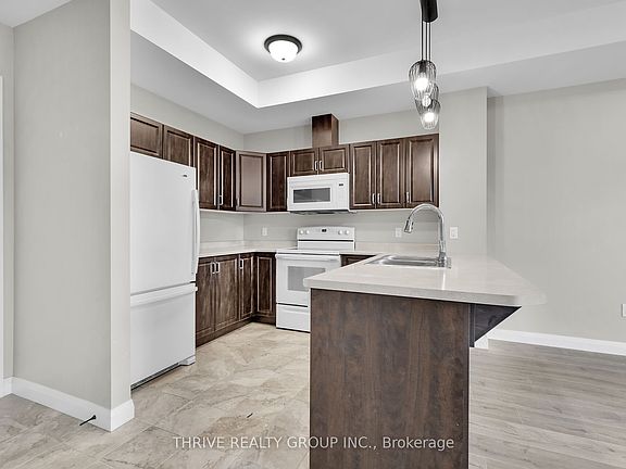 Step into this spacious top-floor condo, featuring a generously sized kitchen adorned with timeless ceramic tile flooring and solid wood cabinetry offering plenty of storage. Gather around the peninsula with seating for four barstools, seamlessly connecting the kitchen to the living room, which then opens up to a welcoming patio. The lofty 10-foot ceilings and oversized windows, provide abundant natural light throughout. The versatile den serves as an ideal nursery, guest room, or home office. Experience the simplicity of condo living in serene countryside surroundings, just a quick 20-minute drive north of London.