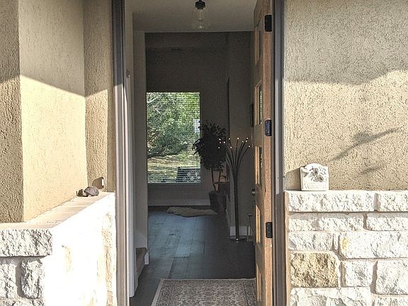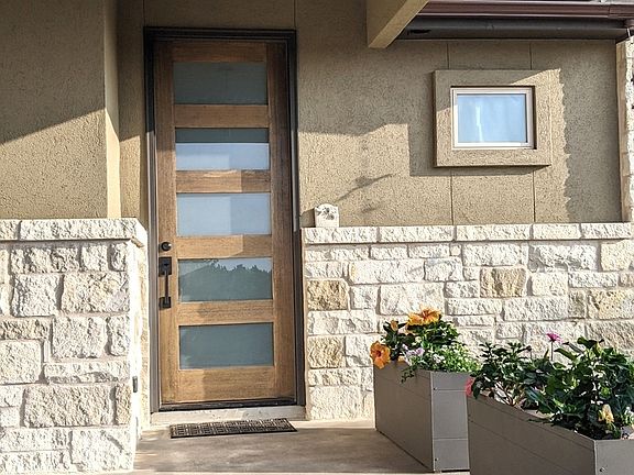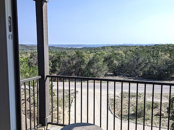 Stunning custom home in the gated and exclusive Legends at Rancho Del Lago. Only 2 years old and gently lived in. One acre corner lot with gorgeous mature oaks, cleared for maximum privacy leaving the native persimmon and agarita for the wildllife. Xeriscaping close to the house filled with Texas natives for ease of maintenance. Butterfly and hummingbird friendly! 100 percent stone and stucco. Plenty of room to expand with a workshop or casita, there is even an RV sewer connection by the garage. The oversized, detached garage itself is insulated (door as well) with a window and side door, with plenty of attic storage. The circular drive invites you to the wide steps and up to the modern front door and large porch. Open the door to a spacious floor plan with beautiful dark, matte wooden floors. Huge custom sized windows to make the most of the abundant natural light. The kitchen is a chefs dream with a huge island that houses a Cattura downdraft thet rises with the touch of a button! A lovely deck through French doors off the master bedroom for that morning coffee. And the view, through another set of French doors leading onto the balcony, is spectacular. The sunrises over the hill country and down to Canyon Lake are epic. The second downstairs bedroom is currently an office with secret cupboard! It could be the perfect set up for working from home when the barn doors are closed. All the bathrooms are custom and unique with the Master bathroom like a spa resort. Dual vanities, dual shower heads (wall and rain head), dual closets and a soaking freestanding tub with waterfall faucets - wow! Come see for yourself. This house truly is a one of a kind.