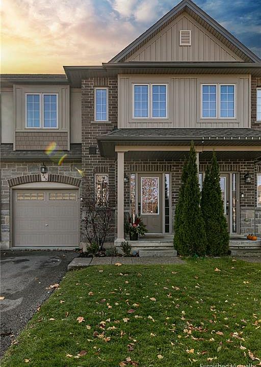 Welcome to 263 Pumpkin Pass in the heart of Binbrook’s family-oriented community. An executive-style townhouse offering comfort, style, and thoughtful upgrades. You’re welcomed by a spacious inviting foyer, an “exhale” space where you can decompress as you come in, set down your bags, hang coats in the entry closet, or slip inside directly from the garage. There’s plenty of room to greet guests, with a convenient 2-piece bath nearby. A beautifully upgraded wood staircase anchors this entry and sets the tone for the warmth and quality found throughout the home. The main floor opens into a bright living room designed for families and entertainers alike. The oversized living room features a versatile play nook or home office, while the eat-in kitchen has granite countertops, stainless steel appliances, quality cabinetry, and a charming pass-through window overlooking the living room. The dinette offers a walkout to fully fenced backyard with a wood deck and green space ideal for summer dinners, kids, pets, and relaxed outdoor living. Upstairs, a cozy loft area functions perfectly as a reading nook, homework spot, or office space. The second level has 3 bedrooms, 2 full baths, and second-floor laundry. The primary bedroom is complete with a walk-in closet and a 3-piece ensuite. This level also features engineered hardwood flooring in the hallway, nook, and primary bedroom adding both style and durability. The fully finished basement expands your living options with a large recreation room suitable for movie nights, a second office, kids’ play area, gym space, or whatever fits your lifestyle?. Plus. ample room for storage.? This turnkey home offers hardwood floors, upgraded counters, stainless appliances, engineered hardwood, a finished basement, and thoughtful spaces on every level. Whether you’re starting out, growing, or settling into your next chapter, this home offers something for everyone. Steps to schools, parks, walking trails, all Binbrook is loved for.