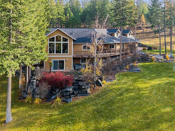 Enjoy peace and tranquility in this outstanding home on a beautiful 10-acre parcel perfectly located just minutes away from Herron Park, Foys Lake and Kalispell. Tucked amongst mature parked-out pines, the 3-bdrm, 3-bath home offers 4632 square feet with a great floorplan. The main floor features all the essentials with open concept living including a living room with floor-to-ceiling windows and a propane fireplace, dining and kitchen areas, the primary suite, laundry area, and a 3/4 guest bathroom. The lower walk-out level has a recreation room, two guest bedrooms, a full bathroom, and storage & mechanical rooms. There is a large bonus room over the garage with 644 sq ft of flexible space. Outside are decks and patio areas to bask in the beauty of nature, and a large garden and orchard surrounded by deer fencing. You'll also appreciate the great workshop area along with an attached 2-car garage. Roof new in 2023. The good life is alive and well in Montana!