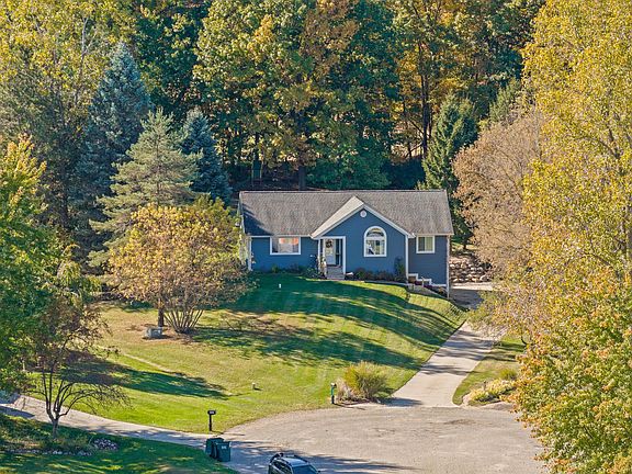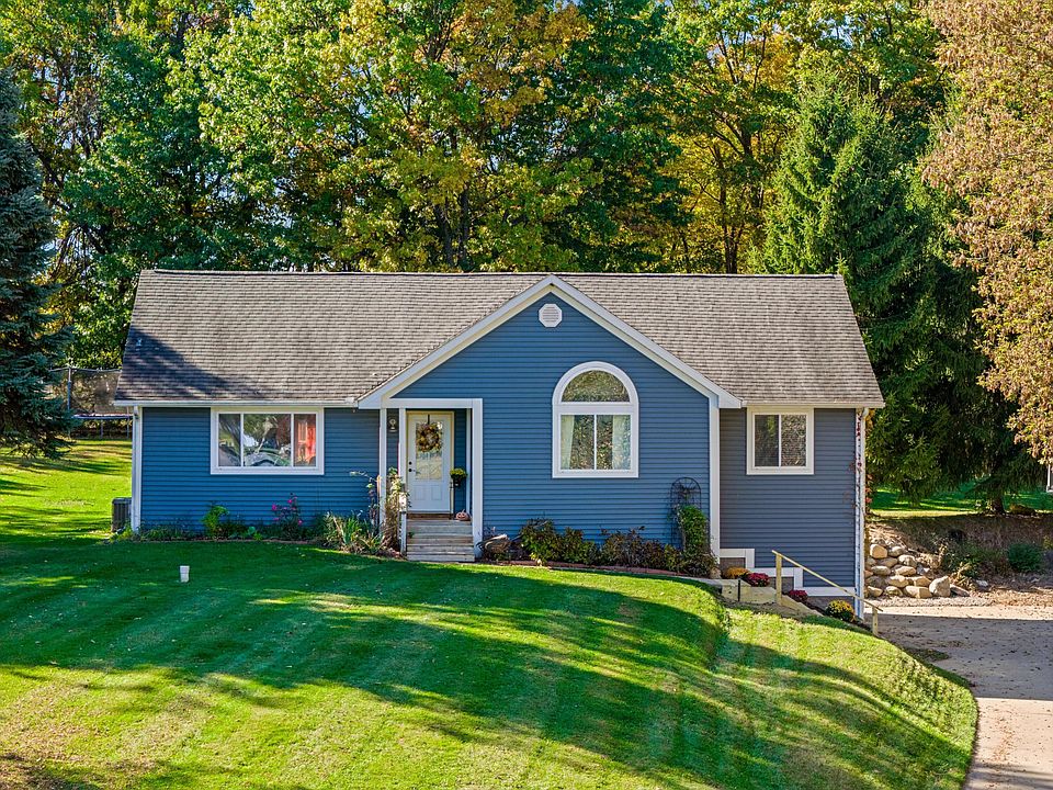 Welcome to this desirable 3-bed, 2-bath ranch situated on a picturesque 1.15 acre cul-de-sac surrounded by stunning mature trees. This open-concept home is bathed in natural light, featuring cathedral ceilings, updated flooring & fresh paint in main living areas, primary suite, and baths (Fall 2025). Perfect kitchen for hosting gatherings includes an expansive granite peninsula, cabinet storage with drawers, open shelving & new wall sconces. All appliances included! Enjoy seamless indoor-outdoor living with new front exterior staircase, updated hardscape, a fire pit & spacious back deck overlooking the serene, wooded yard. Recent mechanical updates offer true peace of mind: 2023 water heater, reverse osmosis system & water softener; 2021 well pump & siding; 2019 A/C. Convenient main floor laundry. Full basement w/ walkout to garage. Nestled in nature yet moments from Holloway Reservoir Regional Park—this property offers the perfect blend of beauty, comfort, peace, and convenience!