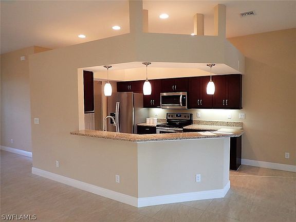 BRAND NEW POOL HOME ON FRESH WATER CANAL---located off Santa Barbara Blvd--all living areas plus master bedroom & rear bedroom have waterfront & pool views. This 4 bedroom, 2 bath pool home has a great room design, Western exposure and sits in a nice canal front neighborhood. Some features include tile floors through out with carpet in all 4 bedrooms, 1990 square feet of living area, granite counters in kitchen and baths, under cabinet lighting in kitchen, inside laundry room with deep sink. Lanai & pool (approx. 13x26) will be screened & completed with pavers. The master bedroom has sliding glass doors out to screened pool area, 2 walk-in closets, dual sinks with separate soaking tub & walk-in shower. Stainless steel kitchen appliances included: side by side refrigerator, smooth top range, dishwasher & microwave to be provided about 1 week before closing. Single hung Low E tinted dual pane insulated glass windows, 2 ceiling fans, irrigation system & upgraded landscaping are some other features. Home connected to city utilities, buyer to assume balance of utility assessments. Thank you.