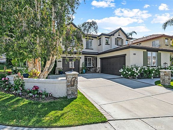 Introducing a gorgeous Skyview POOL home perched atop the sought-after Stevenson Ranch, nestled on a serene cul-de-sac street featuring OWNED SOLAR. Spanning nearly 3000 sqft with an east facing front door, this residence encompasses 5 generous bedrooms, including one on the main level with a full bathroom. Inside, discover an inviting open layout with distinct formal dining and living areas accentuated by lofty vaulted ceilings. The updated gourmet kitchen is a chef's dream, showcasing newly adorned porcelain countertops, sleek tile backsplash, stainless steel appliances, dual ovens, a breakfast nook, island with bar seating, updated white cabinetry, and a walk-in pantry. Seamlessly connecting to the expansive family room, complete with a cozy fireplace and abundant natural light. The kitchen also offers direct access to the backyard oasis through a convenient slider. Retreat to the spacious master suite boasting enhanced closet space and a luxurious ensuite bath with dual vanities, soaking tub, separate shower, and a sizable walk-in closet. Outside, enjoy resort-style living with a recently upgraded pool and spa, complemented by a custom paver deck, patio seating, wood lattice cover, artificial turf, and a safety-conscious pool fence. Additional features include fresh exterior paint, a new front door, modern lighting fixtures, a recently installed water heater, recessed lighting, dual-zone A/C, an upstairs laundry room with a sink, plantation shutters, contemporary baseboards, and crown molding throughout. Perfectly situated for convenience, with easy freeway access, proximity to shopping and dining options, and mere steps from Richard Rioux Park offering recreational amenities like tennis courts, a baseball diamond, playground, walking trails, and expansive green spaces. Plus, enjoy the added perk of being within walking distance to the award winning Stevenson Ranch Elementary.