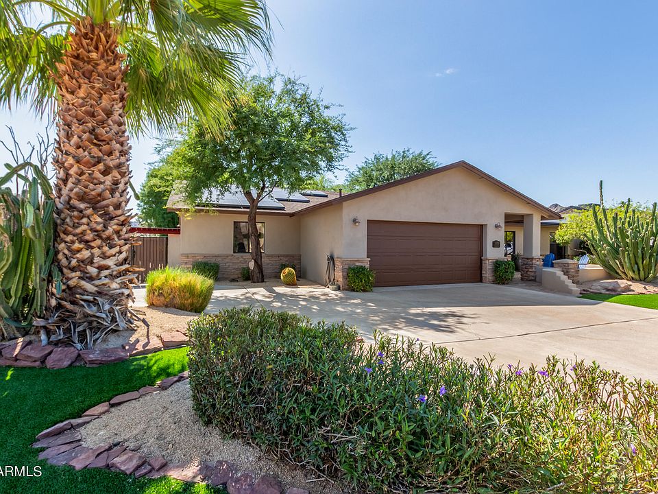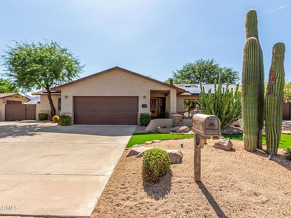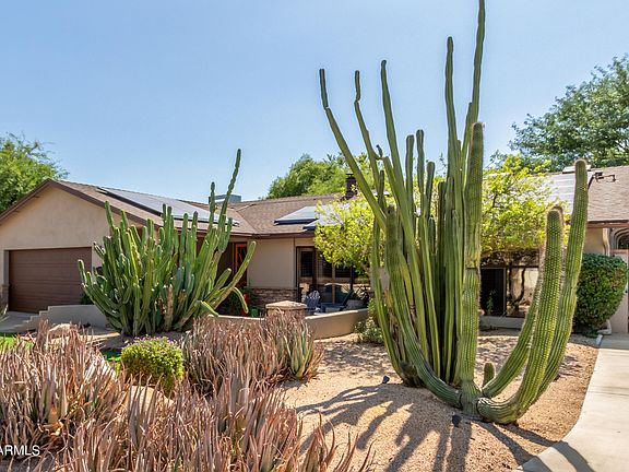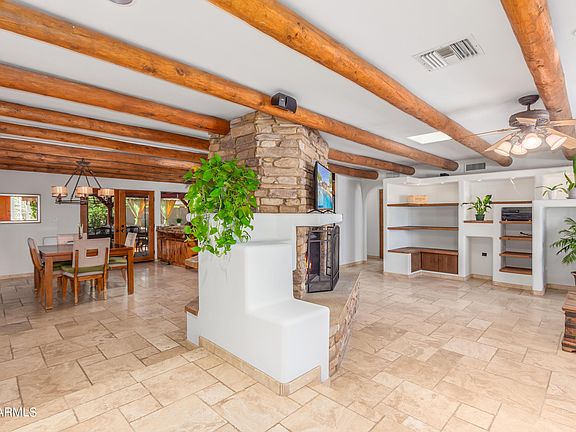 Stunning rare 0.50-acre Corner Lot Retreat in the coveted Sheaborhood! Welcome to this Energy-Efficient, Solar home w/a lovely stone facade, meticulously manicured landscaping, RV gate with concrete covered side yard, & inviting front patio. Inside, you'll find beautiful tile flooring, plantation shutters, & recessed lighting complementing the rustic charm of exposed wood beams. The formal living room is anchored by a stone-accented fireplace & media niches, making entertainment & everyday living blissful. The additional family room is an ideal space for gatherings. The gorgeous kitchen boasts hardwood cabinets, SS appliances, tile backsplash, granite counters, & a breakfast bar. The generously sized primary bedroom offers French doors access to the back patio, multiple closets, & an immaculate ensuite.The fourth bedroom has an additional private entrance. Step outside to truly amazing outdoor living showcasing a shimmering pool, built in BBQ, large covered patio, two gazebos, large detached workshop/shed, and mountain views promising endless hours of relaxation & recreation. Close to the Biltmore, Desert Ridge and the 51 freeway for easy downtown access. This home is the one you have been waiting for!