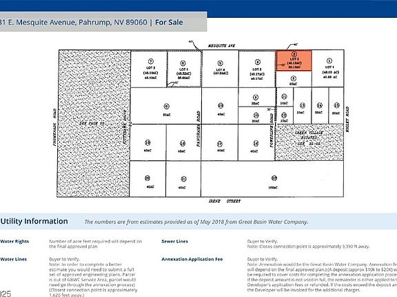 +/-20.10 industrially zoned vacant land. Property is located in North East Pahrump and South East corner of Mesquite Avenue and Powerline Road. The roads have been paved. +/- 21,000 cars per day at Highway 160, 200' W of SR 372 +/- 3,000 cars per day at highway 160, 0.1 mile of SR 372.