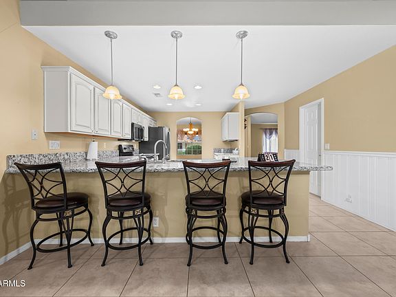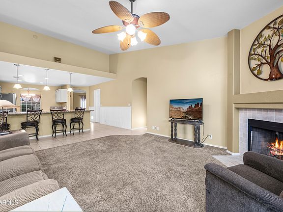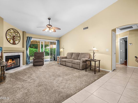 Located in a beautiful subdivision with easy access to the 202, this home is across from a large community greenbelt. Well cared for home with an updated kitchen and lush, relaxing backyard! Featuring a covered hot and cold spa with a lap swim setting for year-round recreation. Backyard also features a large, covered patio, expansive pavers, grass area, newer shed, and built-in entertaining area that can be fitted with a grill. Inside, vaulted ceilings and a fireplace make the home feel spacious and warm. The primary and second bedroom feature walk-in closets. The primary suite bathroom has a dual sink vanity plus an accessible, step-in tub/shower. Home is a short walking distance from Sheepherders Park with pickleball courts, playground, and horseshoes, and Stapley Aquatic Park.