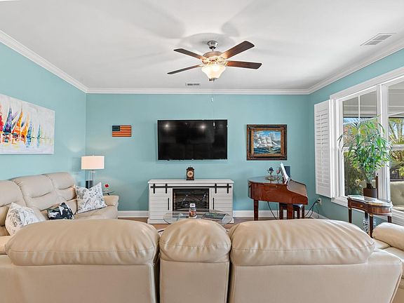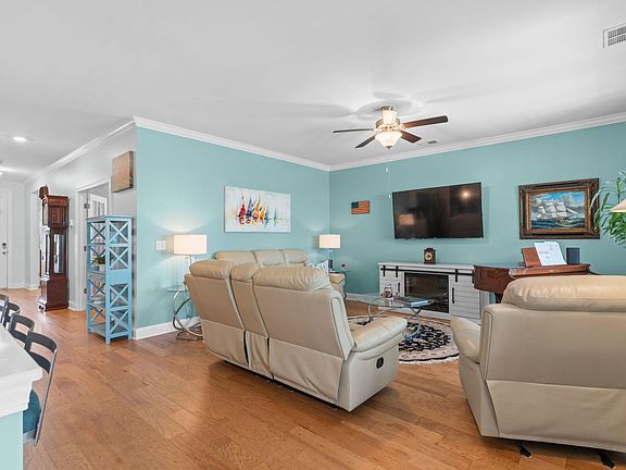 This is a beautiful DR Horton Bradford Plan home! Featuring durable Hardie siding, a welcoming front porch, a rear covered porch with peaceful water views, and lavish landscaping. This property also includes hurricane shutters, a fenced yard, an irrigation system, and has been recently painted. Inside, the split-bedroom design highlights a spacious open-concept layout with a bright kitchen, dining, and living area. The kitchen includes quartz countertops, an oversized island with breakfast bar, stainless steel appliances, a gas range, tile backsplash, and a large pantry. Hardwood flooring, crown molding, 5" baseboards, custom plantation shutters, and ceiling fans add a touch of elegance throughout the main living spaces. The large primary suite is at the back of the home and offers a luxurious bath with dual vanities, a walk-in tiled shower, and a generous walk-in closet. French doors open to a versatile flex room—perfect as an office, den, formal dining, or even an additional bedroom. Upstairs, you’ll find a private bedroom, full bath, game room or additional living space, plus extra storage. All baths and the laundry feature upgraded porcelain tile. Located in Summit at Meridian, residents enjoy outstanding amenities including a spacious community pool and an indoor pickleball court. Conveniently situated just minutes from the beach, marinas, parks, restaurants, shopping, golf courses, hospitals, and more—including The Market Common, Coastal Grand Mall, Tanger Outlets, Myrtle Beach State Park, and Myrtle Beach International Airport—this home truly offers the best of coastal living!